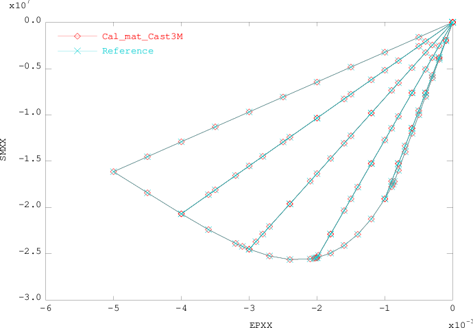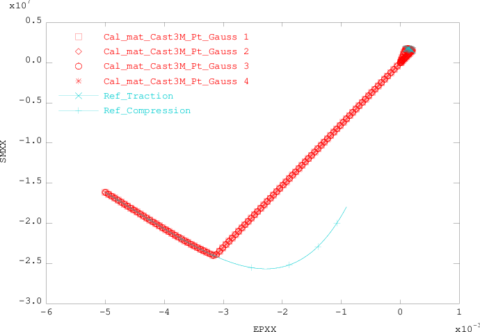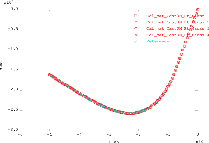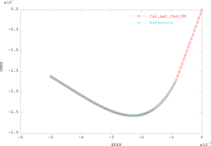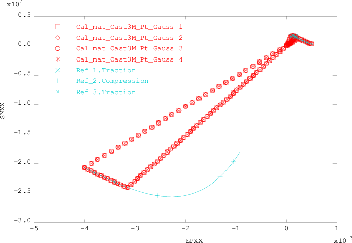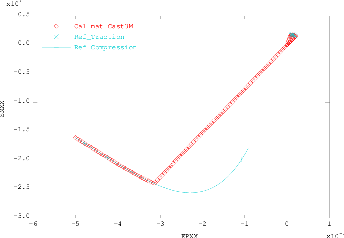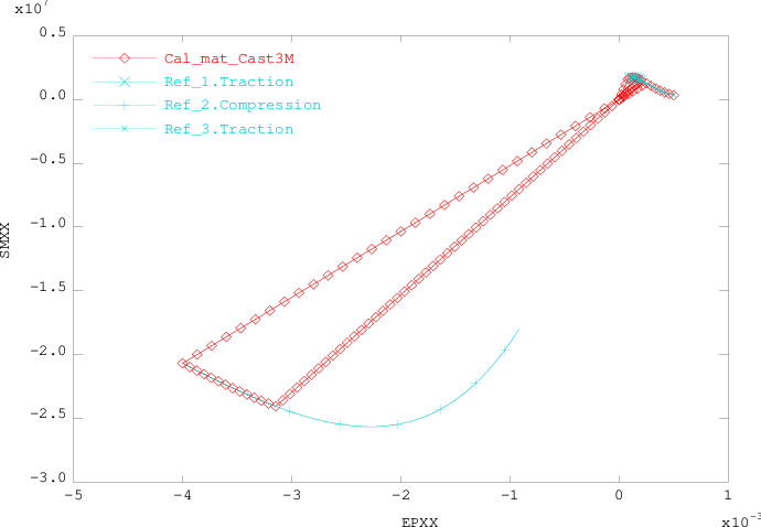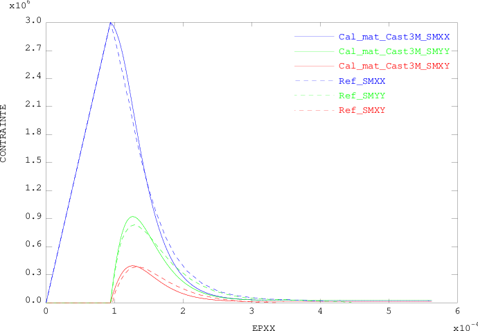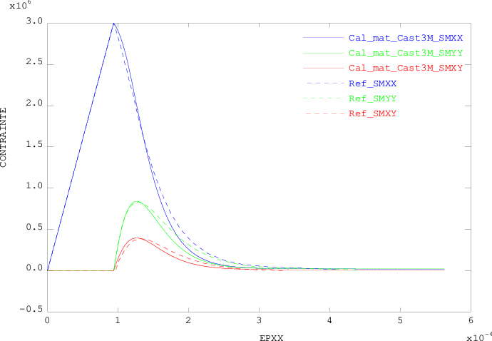 On a choisi des résultats numériques de référence : ceux obtenus par l'équipe LGCNSN (R&DO - Ecole Centrale de Nantes) participant au benchmark du projet MECA [2] avec un modèle d'endommagement isotrope du même type que le modèle Mazars de Cast3M. Il s'agit de courbes contrainte-déformation pour les trois composantes de contrainte activées, nommées 4a. LGCNSN Iso dans [2] et notées Ref_SMXX, Ref_SMYY et Ref_SMXY dans les figures suivantes, auxquelles les courbes calculées d'évolution de ces trois composantes de contrainte en fonction de la déformation peuvent être comparées.