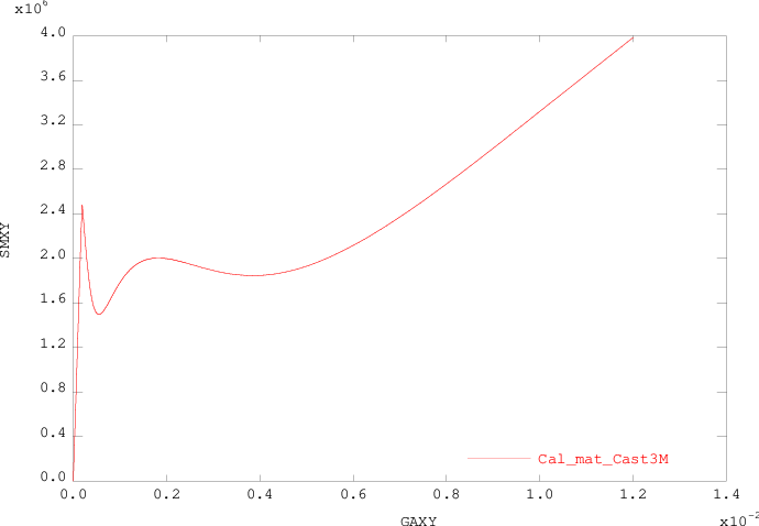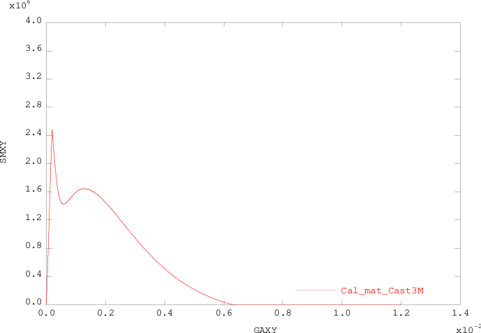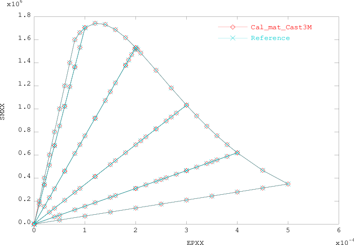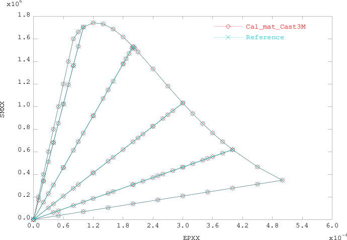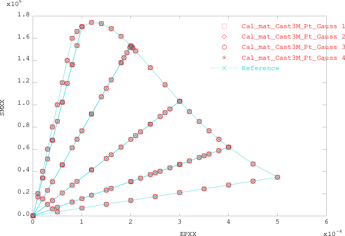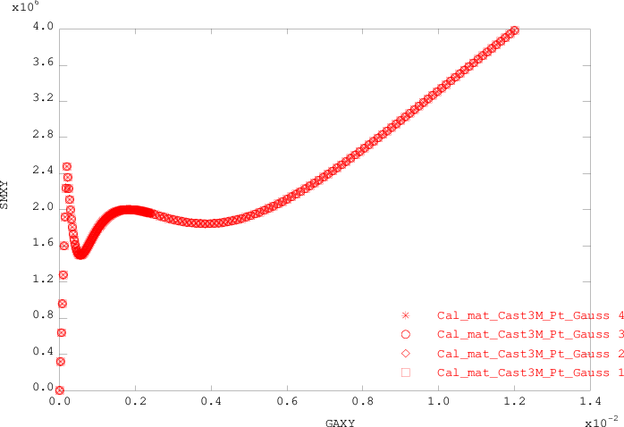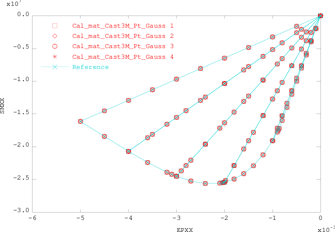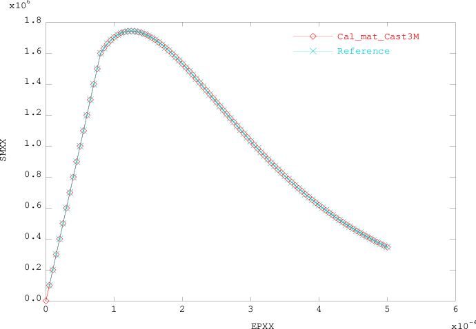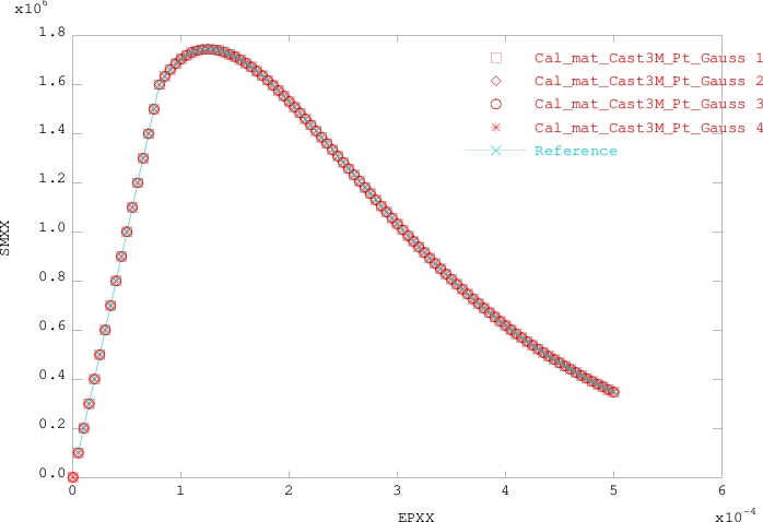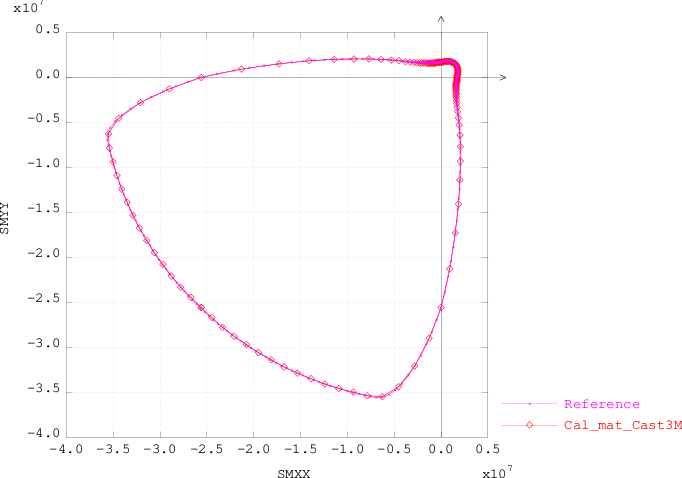 On a choisi des résultats numériques de référence : ceux obtenus par l'équipe LGCNSN (R&DO - Ecole Centrale de Nantes) participant au benchmark du projet MECA [2] avec un modèle d'endommagement isotrope du même type que le modèle Mazars de Cast3M. Il s'agit de courbes contrainte-déformation pour les trois composantes de contrainte activées, nommées 4a. LGCNSN Iso dans [2] et notées Ref_SMXX, Ref_SMYY et Ref_SMXY dans les figures suivantes, auxquelles les courbes calculées d'évolution de ces trois composantes de contrainte en fonction de la déformation peuvent être comparées.