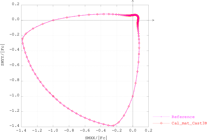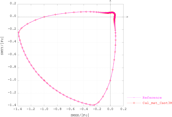 Dans la courbe de biaxialité normalisée, \(f_{c}=-25,64~MPa\) est la contrainte limite en compression déterminée dans un calcul de référence en contrainte imposée de compression monotone uniaxiale. la courbe calculée de biaxialité normalisée est jugée satisfaite si elle coupe les axes du repère aux deux points \((-1~;~0)\) et \((0~;~-1)\).