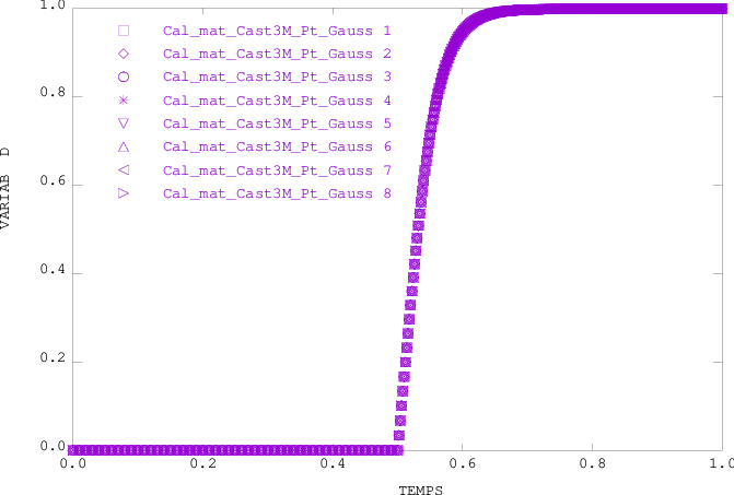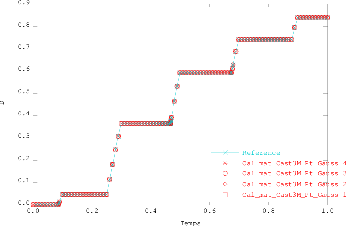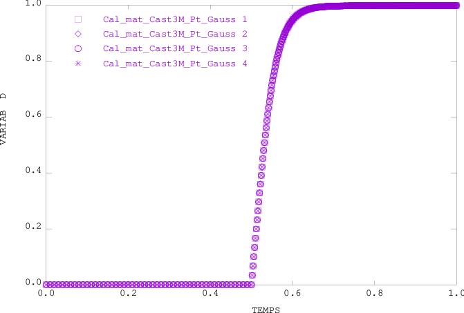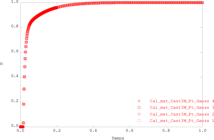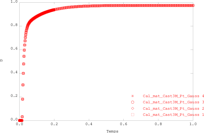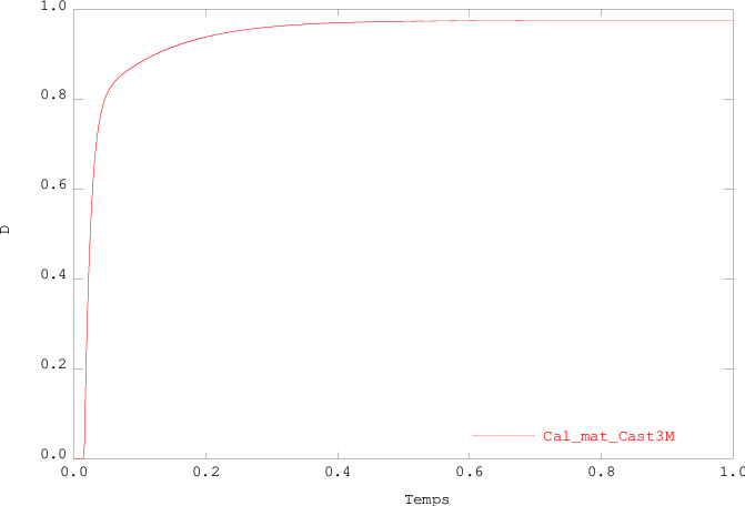 Contrairement aux cas de chargements en déplacement imposé traîtés précédemment, dans les cas de chargement en contrainte imposée comme celui-ci, l'évolution temporelle de l'endommagement n'est pas prévisible et celle du déplacement qui en dépend ne l'est pas non plus. Or, du fait des dimensions géométriques unitaires du cas-test, la déformation est équivalente au déplacement et donc l'évolution temporelle de la déformation n'est pas définie a priori. En conséquence, les évolutions temporelles de l'endommagement qui dépend de celle de la déformation ainsi que l'évolution temporelle de la contrainte qui dépend de celle de l'endommagement ne sont pas définies a priori, ce qui ne permet pas de donner une solution analytique au problème.