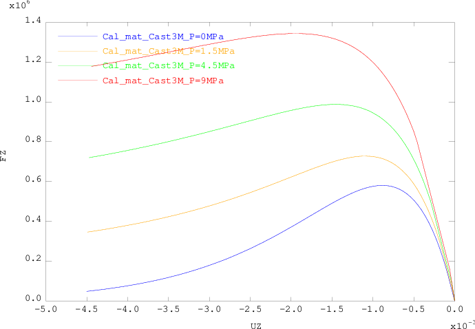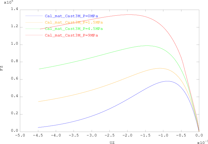 Le chargement triaxial est la combinaison de deux phases successives : La mise en place au préalable d'un état de confinement auquel on ajoute ensuite un chargement de compression simple en déplacement imposé négatif. On réalise le test dans quatre états de confinement différents qui correspondent aux quatre valeurs de pression hydrostatique, c'est-à-dire de contrainte normale de compression, suivantes : P = 0 Pa/ 1,5 MPa/ 4,5 MPa/ 9 MPa. On applique ensuite le chargement de compression en déplacement imposé négatif, croissant en valeur absolue, jusqu'à atteindre le déplacement maximal : \(u_{max}=-4,5.10^{-3}\) m.
