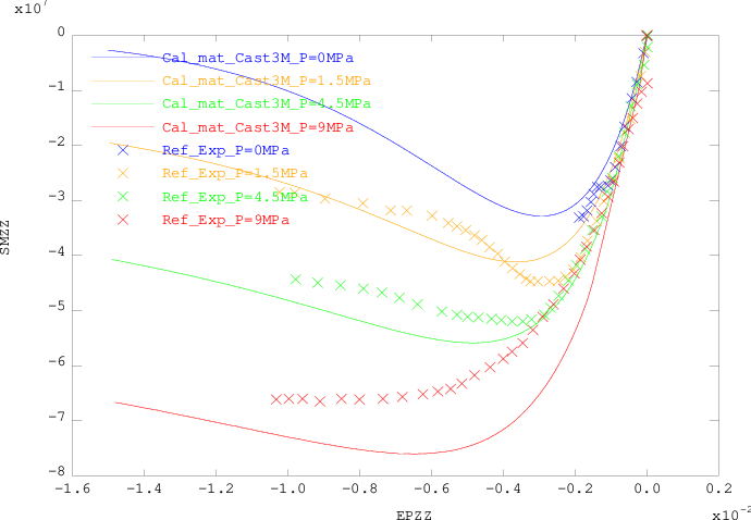 Les écarts sont quantitativement significatifs. Cependant, la tendance des courbes expérimentales est qualitativement reproduite par le calcul. En conséquence, les résultats du cas-test mazars_triaxial.dgibi en mode 3D volumique sont jugés satisfaisants.